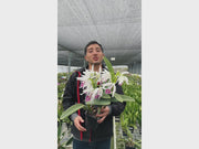 Features the classic semialba form with white petals and sepals contrasting against a vibrant purple lip. Due to the selected clone parentage ('Angel' x 'Rolando'), flowering can vary significantly in size, color intensity, and lip patterning, offering collectors the excitement of discovering each plant's individual expression.